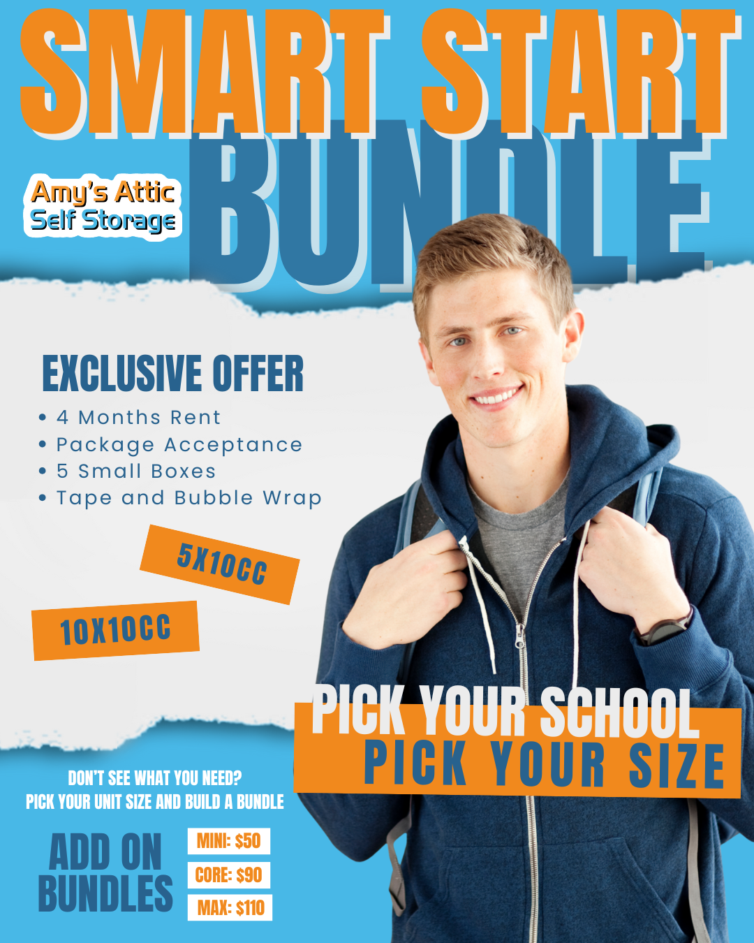 Amy’s Attic Self Storage summer BUNDLE program is designed specifically for students who need a simple, reliable place to store their belongings between semesters.