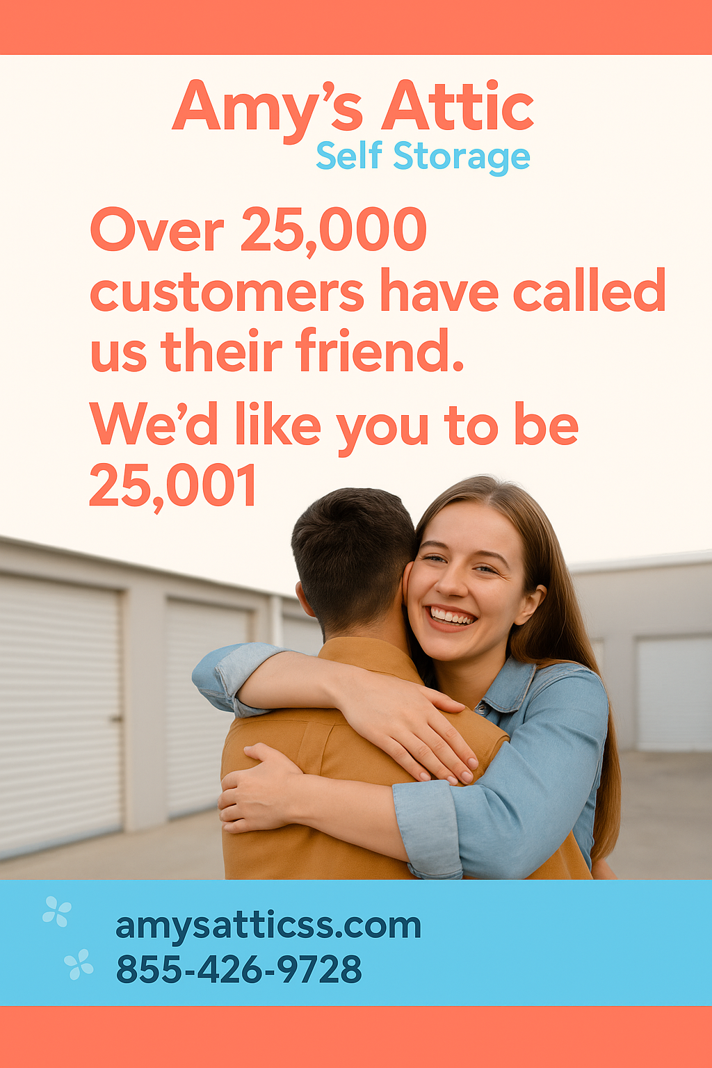 Love storing with Amy’s Attic? Tell your friends! When you refer a friend to Amy’s Attic Self Storage, they’ll get 25% off their first full month of rent—and as a thank-you, you’ll receive a $25 gift card or account credit once they move in.